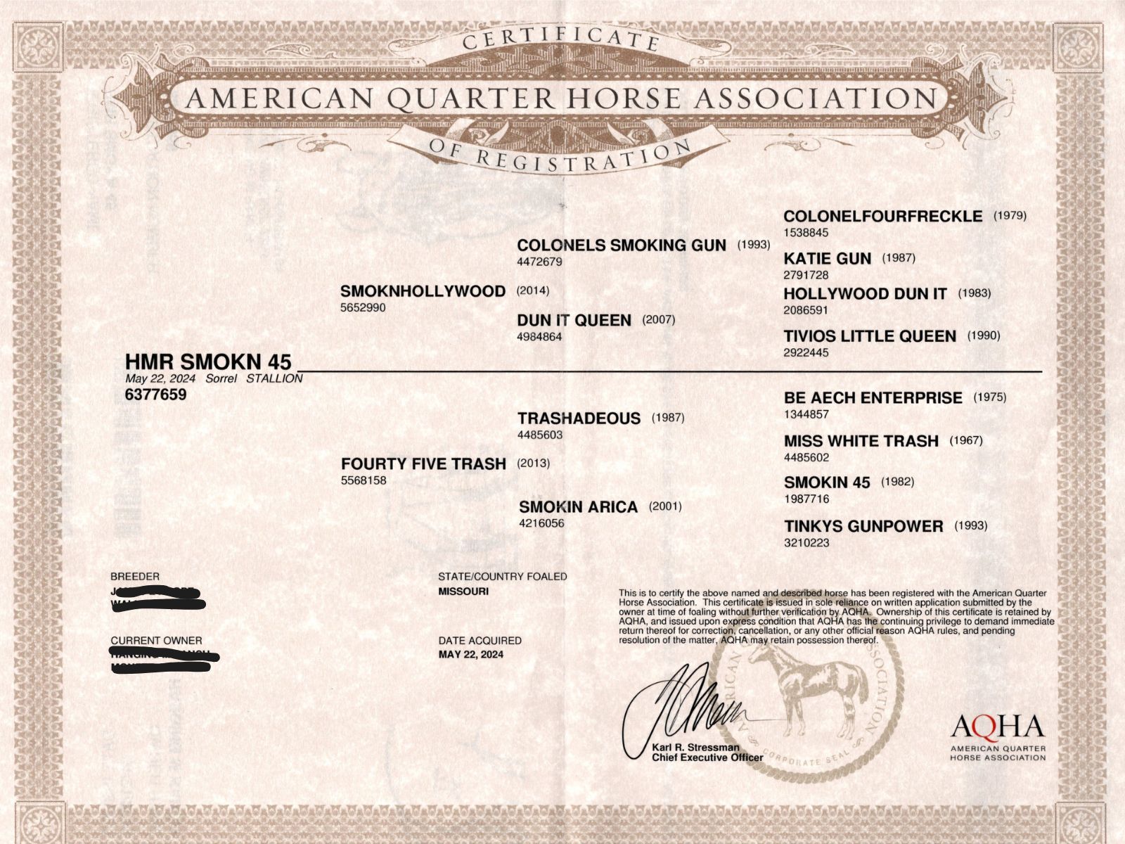 This stud colt is a beautiful Cremello with blue eyes and a blaze face, he was born on April 7,2025. This colt is out of an own son of Gunner, SmoknHollywood (5652990) and a Chex mare, NU STYLEN (5627804). This colt should have the ability to go any direction you would want to go in. He is smart and gets along great with other horses. He was just pulled up from pasture and will only get better and better. We just wormed him. This colt is very intelligent he leads; you can pick up all of his feet; he loves bathes and being brushed. If you’re looking for a stud prospect or something to compete on don’t miss out on this one. We will pull coggins on him when he sells and put them in new owner’s name. Located in Monett, Mo.