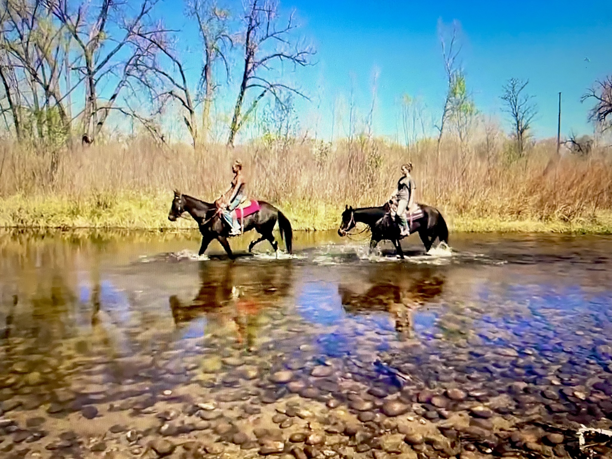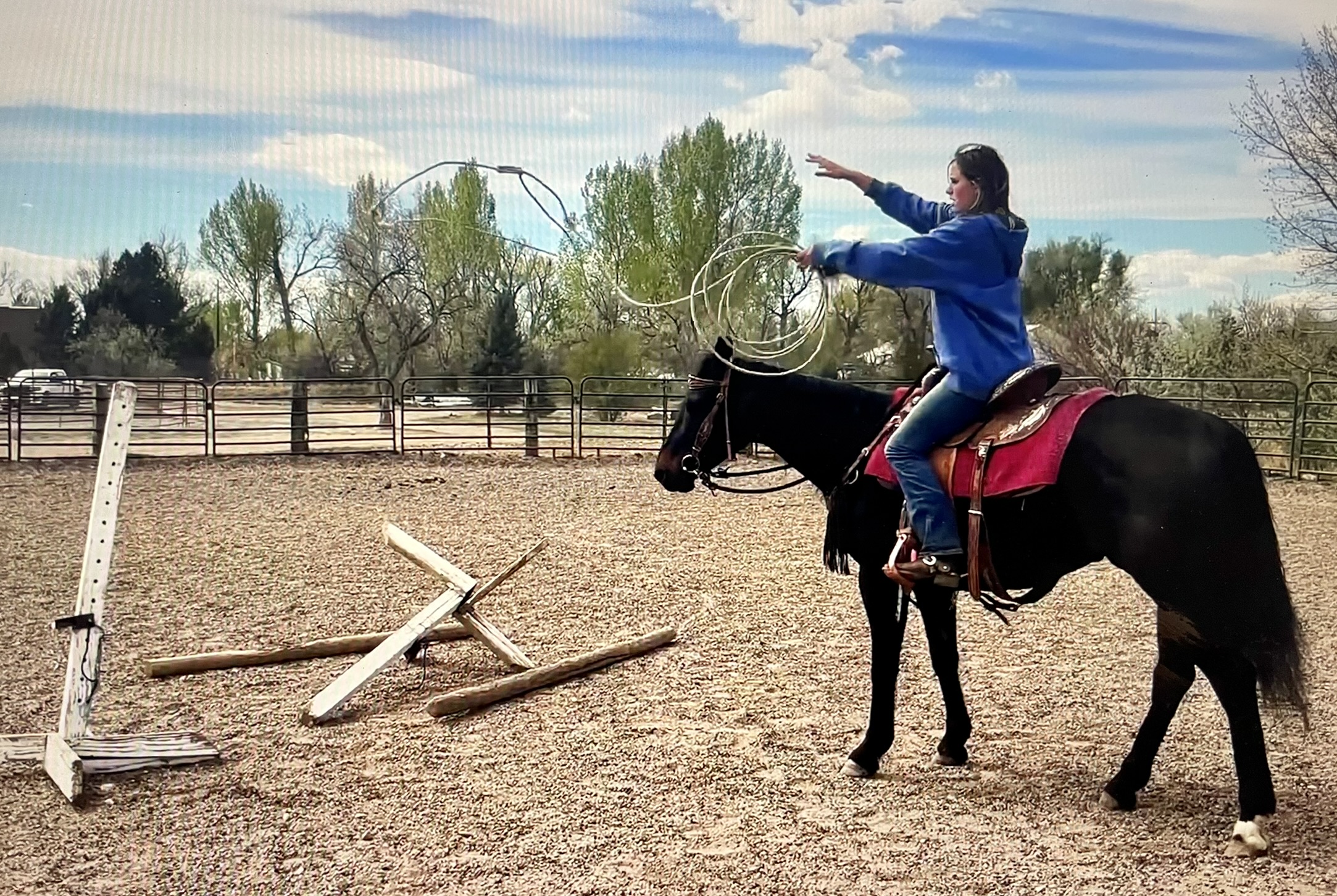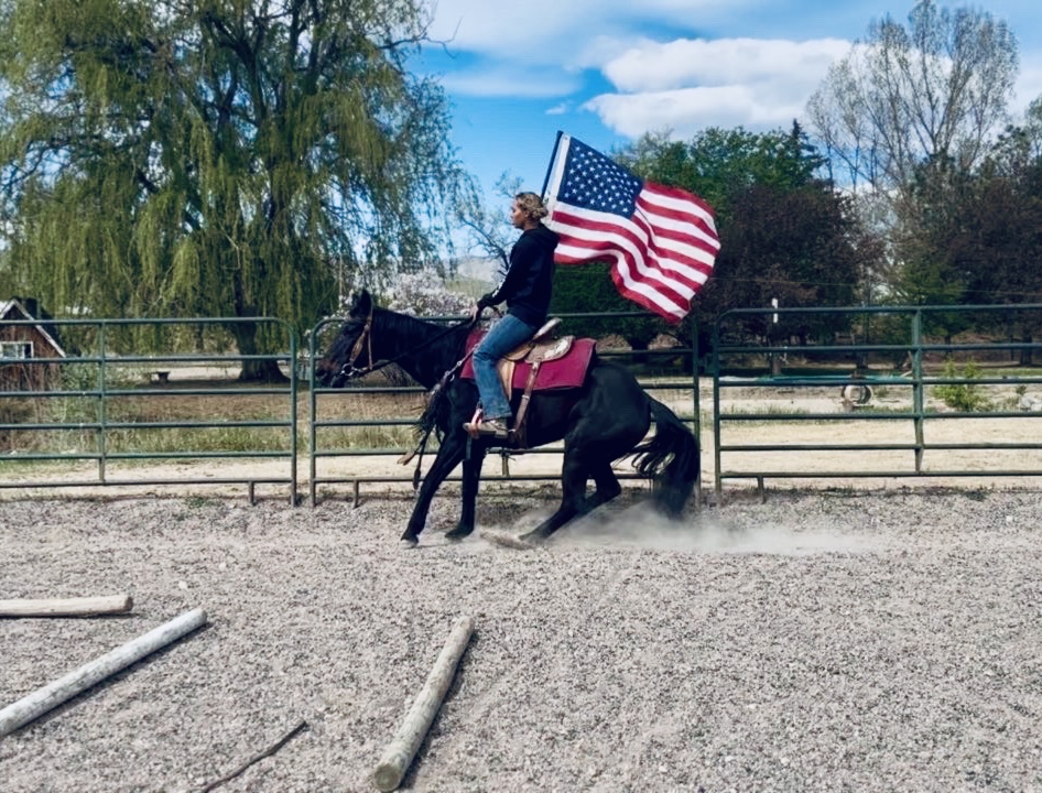 She’s had ropes thrown off her, been part of my kids’ vaulting practice, trail ridden extensively, taught kids’ lessons, done camps, competed in our gymkhanas, been in town, pushed cows,carried flags, walked over tarps and done just about everything you can imagine on our ranch.