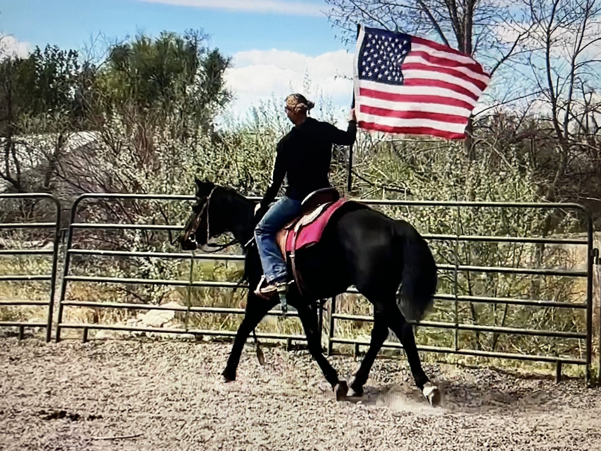 Oakley is easy to catch, great for the farrier and vet, self-loads and backs out, great around farm life and wildlife, loves baths and water, and will stand tied all day.