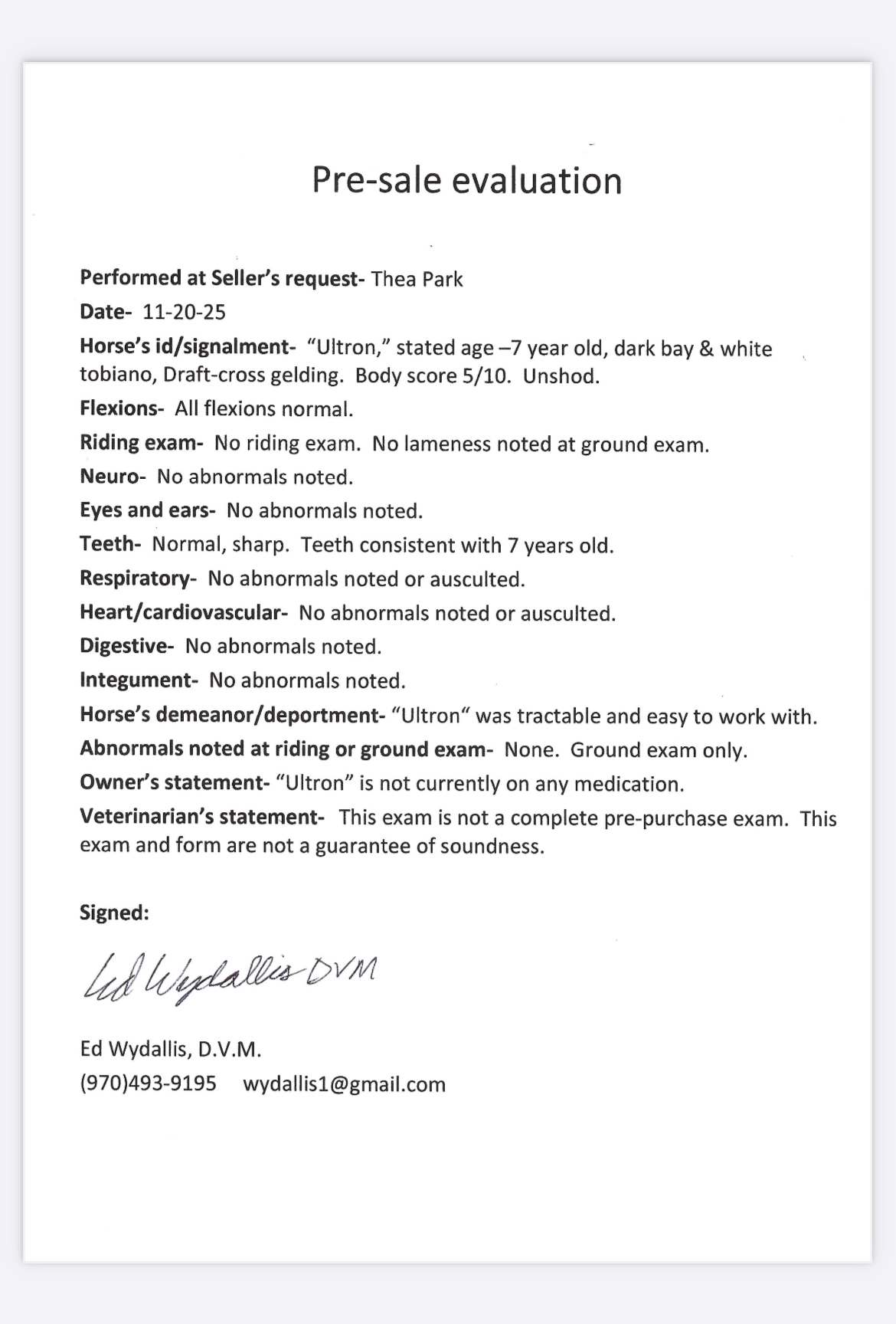 Ultron is the kind of gelding who bonds closely with his person, is easy to catch, and loves attention. He gets along with all types of horses and livestock, is respectful in the herd, and stands tied, loads, bathes, and is great for the vet and farrier.